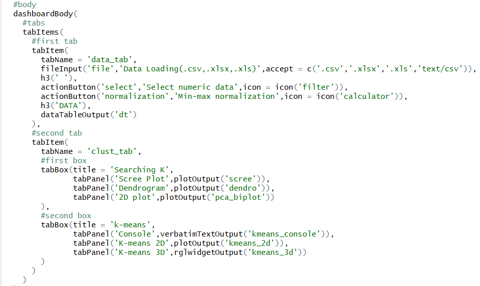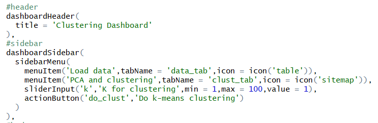 사이드바에서는 보통 sidebarMenu로 형태를 정하게 됩니다. 이 함수를 통해 어떤 메뉴 아이템, 즉 탭이 들어갈 지 확인할 수 있으며, menuItem이란 함수에서 tabName을 지정함으로서 해당 메뉴를 클릭하면 다른 화면을 쓸 수 있게 해줍니다. 즉 Load data라고 써져있는 메뉴를 클릭하면 data_tab이라는 탭을 body부분에서 출력하게 되며, PCA and Clustering이란 탭을 누르면 clust_tab이란 탭을 출력하게 됩니다. 이 외에도 평범한 인풋, 액션버튼들을 집어넣을 수 있는데, 이 예제에서는 슬라이더 인풋과 버튼을 넣었습니다.