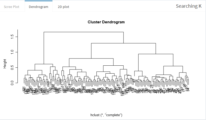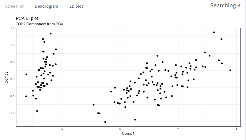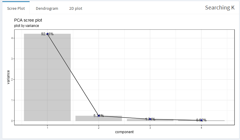 첫 tabBox인 Searching K 첫번째 탭박스는 PCA결과에 따른 plot(요소마다 데이터의 분산을 얼마나 설명할 수 있는지), 계층 클러스터링을 한 결과를 나타낸 덴드로그램, 그리고 상위 2개 요소를 가지고 데이터를 보여주는 plot을 가지고 있습니다.