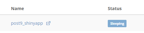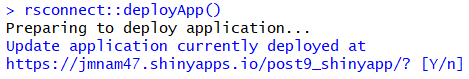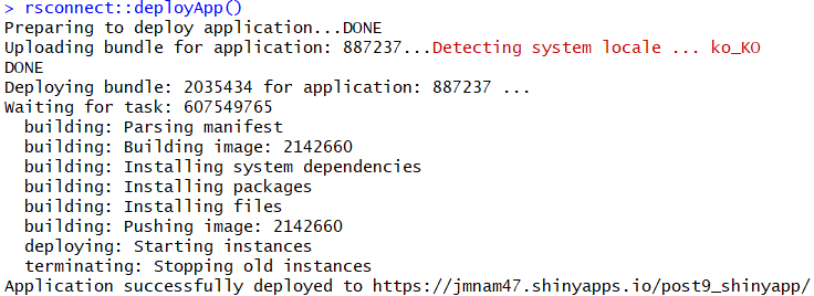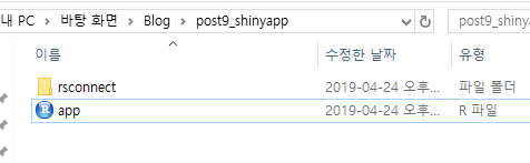 app.R로 준비한 환경 (rsconnect폴더는 필요없습니다) 이제 rsconnect 패키지에서 deployApp 함수를 이용해서 샤이니 앱을 배포합니다. 이 때 deployApp함수에는 해당 디렉토리가 들어가야하며, 저같은 경우에는 바탕화면\Blog\post9_shinyapp이 되겠습니다.(밑의 예제는 이미 저 경로를 작업공간으로 지정하였기에 별도의 문제 없이 작동되었습니다)