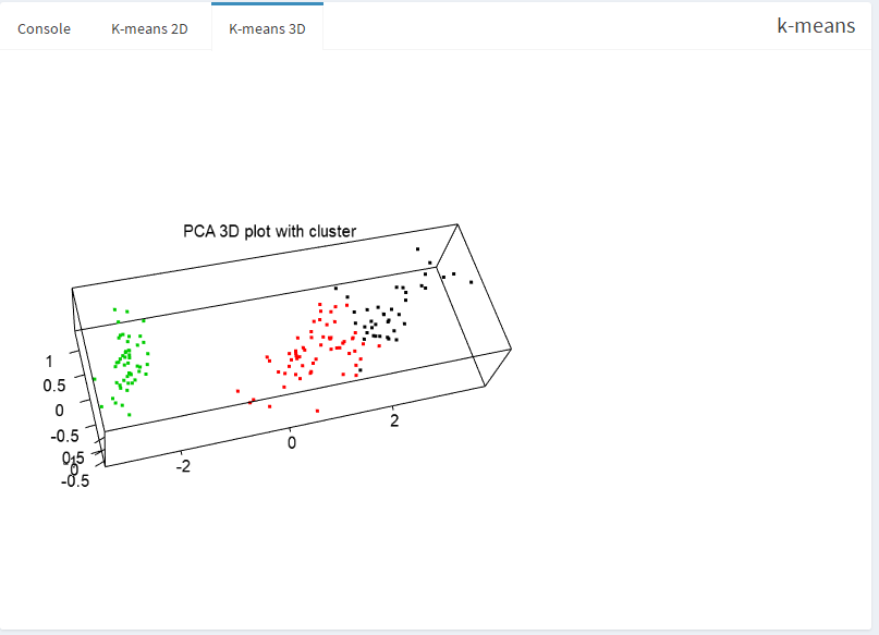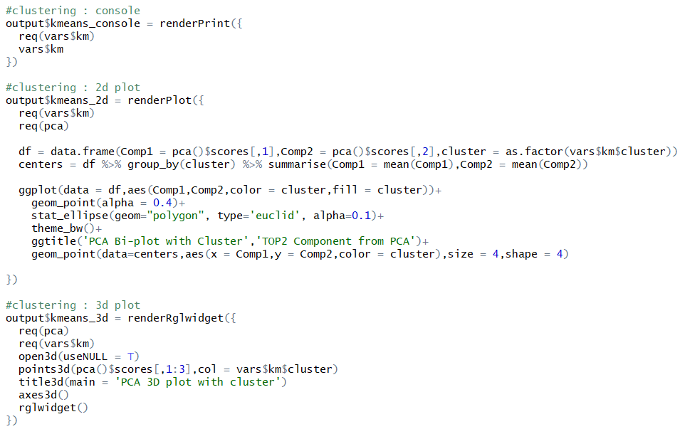 k-means 클러스터링 객체 생성 마지막으로 두번째 탭의 두번째 탭박스에 들어갈 결과물 3개를 정의합니다. 각각 텍스트, plot, rglwidget이므로 해당 양식에 맞게 정의를 해줍니다. rglWidget의 경우 rgl패키지로 만드는 3d plot을 샤이니 대시보드 안에서 띄우도록 도와주는 함수로, 아래와 같이 renderRglwidget에 화면을 정의(open3d)하고 점(points3d)을 집어넣은 후 축(axes3d)을 정의한 후 위젯 정의를 마치면 됩니다.