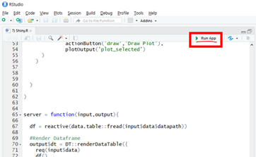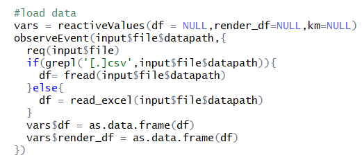 이후 observeEvent함수를 이용해서 데이터를 읽는 동작을 정의합니다. UI부분에서 fileInput의 ID를 'file'로 정의했기에 input의 file 객체의 datapath가 생기면 사용자가 browse 버튼으로 데이터를 올렸다고 생각하여 데이터를 읽는 동작을 진행하도록 합니다. 이 때 grepl함수를 활용하여 데이터가 .csv를 가지고 있는지 아닌지를 파악하여 이 데이터를 fread로 읽을지, 아니면 read_excel함수로 읽을지 선택하게 합니다.