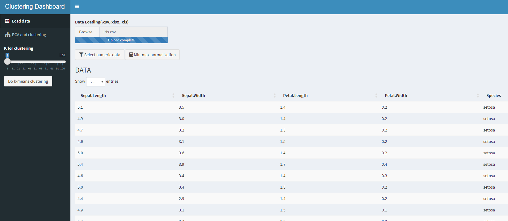 그림에서 보다시피 대시보드의 사이드바는 2개의 탭과 하나의 슬라이더 바, 그리고 액션버튼(Do k-means clustering)으로 구성되어 있으며, 위에 보이는 load data 탭은 저번에 소개한 fileInput(파일 불러오는 기능)과 Data Table, 액션버튼 등으로 구성되어 있습니다. 이제 이 대시보드의 구성요소를 저번처럼 하나하나 뜯어보도록 하겠습니다.