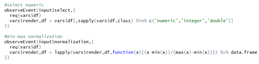reactive값 정의와 데이터 읽는 이벤트 다음은 데이터 변환입니다. PCA나 k-means 클러스터링은 수치변수만 사용할 수 있으며, 클러스터링의 경우 scaling을 해야할 수도 있기 때문에 이 작업을 위해 첫번째 탭에 만든 버튼 두 개(액션버튼, ID : select와 normalization)를 활용합니다. 먼저 수치 변수를 찾기 위해 열별로 class함수를 사용하고 class가 numeric, integer, double인지 확인하며, scaling을 할 경우 minmax normalization을 하도록 합니다. 중요한 점은 이 때 lapply를 해야 데이터프레임으로 형식이 깨지지 않고 바꾸기 편합니다.