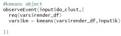 다음은 kmeans 클러스터링을 진행합니다. 여기서는 사이드바에서 정의한 액션버튼을 감지하여 진행하도록 하며, 사이드바의 슬라이더를 통해 조정된 k값을 쓰도록 합니다. 만들어진 객체는 vars에 저장하도록 합니다.