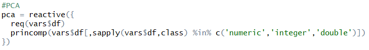 데이터 테이블 랜더링 이제 PCA 결과물을 보여주기 위한 객체들을 정의합니다. princomp 함수를 사용한 결과물은 reactive값으로 저장하게 하며, 여기서 vars$df를 사용하는 이유는 PCA에서는 스케일링을 하지 않기 때문입니다.