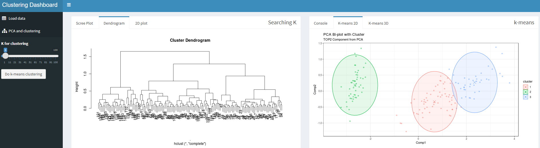 제가 사용한 예제는 간단한 PCA 및 k-means clustering을 해주는 대시보드입니다.