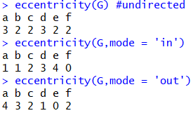 3번째 제목의 3가지는 전부 노드간 거리와 관련된 지표들입니다. eccentricity는 해당 노드가 자신 이외의 노드와의 거리 중 가장 큰 값을 나타내며, 별도의 옵션이 없을 경우 undirected를 상정하고 계산하며, in일 경우 들어오는 거리, out일 경우 나가는 거리 중 가장 큰 값을 보여주게 됩니다.