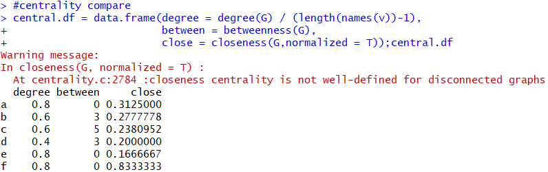 Centrality는 네트워크에서 노드별로 중요한 정도를 표시하는 척도로서, 대표적으로 degree, betweenness, closeness가 있습니다. degree는 위에서 설명했다시피 노드가 다른 노드들과 얼마나 많은 관계를 가지고 있는지이며, degree centrality는 이 degree값을 전체 노드 -1만큼 나눠서 계산합니다. betweenness centrality는 노드가 엣지와 엣지 사이에 얼마나 많이 등장하는지를 나타내며, 이 값이 높을수록 어떤 두 노드 사이에 연관될 가능성이 높음을 나타냅니다. 마지막으로 closeness centrality는 해당 노드에서 다른 노드들로 가기까지의 거리가 얼마나 되는지를 척도로 나타낸 것입니다. 각각 igraph의 betweenness, closeness 함수로 구현할 수 있습니다.