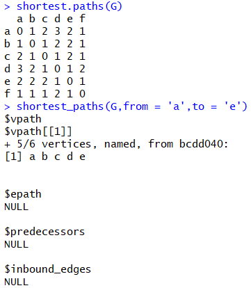 최단거리 구하기는 네트워크 이론의 단골 문제로, 주로 최적경로 산출 문제에 활용되며 TSP(Traveling Sales Person, 외판원 문제) 알고리즘 등 다양한 확장사례들이 존재합니다. igraph에서는 shortest.paths함수와 shortest_paths 함수 두 개를 제공하는데, 첫번째 것은 모든 노드들에 대한 최소거리를 n by n 매트릭스로 표현하는 것이고 두번째는 from과 to를 지정해서 출발지에서 도착지까지 가는 경로 및 거리를 구해주는 함수입니다.