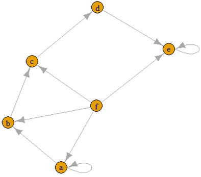 Undirected 그래프 이렇게 생성된 객체는 노드(연결 관계를 가질 객체들, 해당 예제에서는 {a, b, c, d, e, f})들과 엣지(관계를 나타내는 선)를 가진 하나의 네트워크로 전환되게 됩니다. 생성된 네트워크는 plot 함수로 그래프로 호출할 수 있으며, directed 그래프의 경우 아래와 같이 표현됨을 볼 수 있습니다.